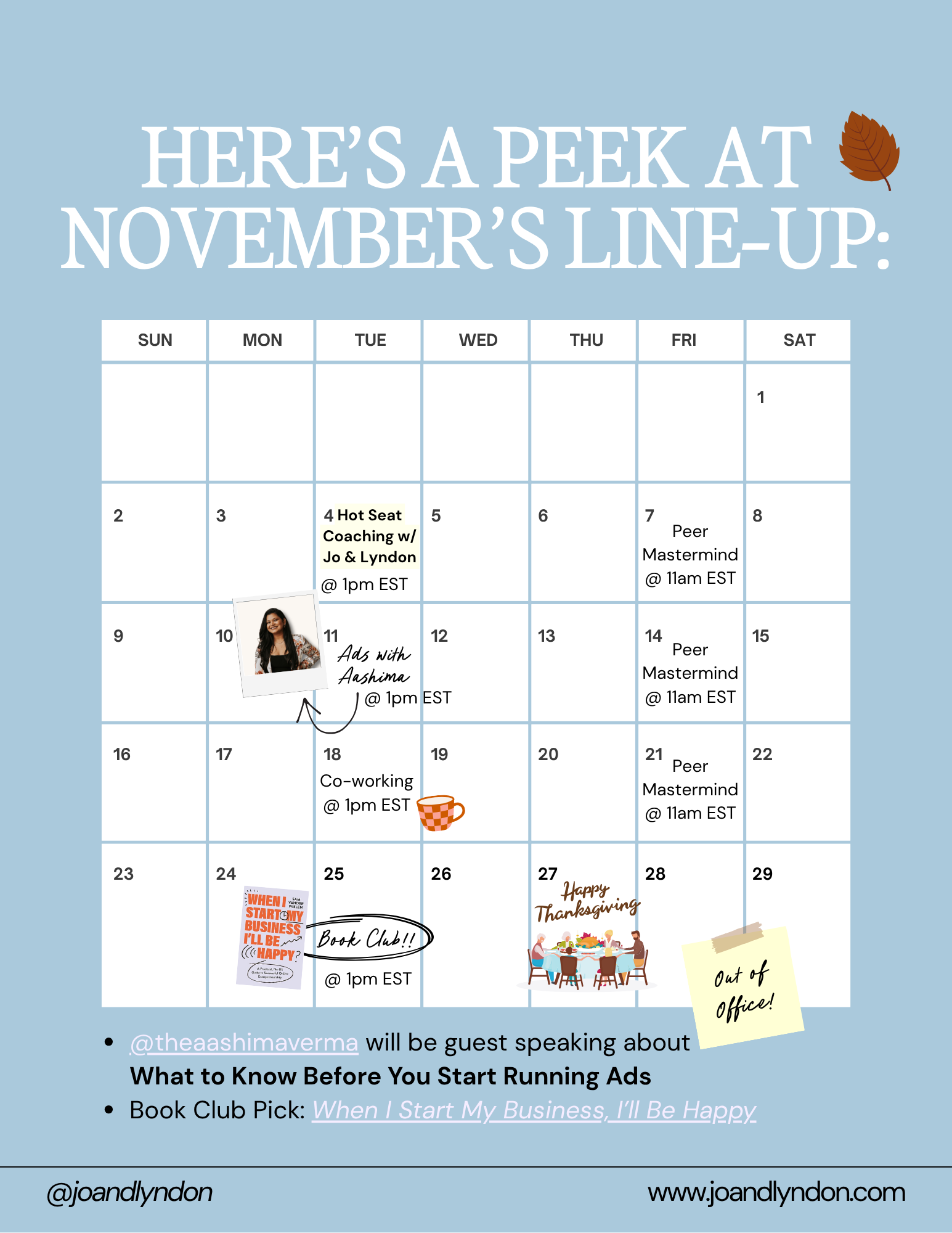 It feels like as soon as you learn about one part of your business there’s something new that you have to learn. Based on the conversations we’re having in The Breakroom, we’ll have a topical masterclass each month taught by us or a guest speaker. Our November masterclass will be “Ads for Beginners” hosted by Aashima Verma, who will share how to start using Ads to market your business. In December we’ll host a Planning for 2026 masterclass.